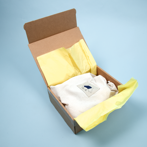 Mei Mei measures 10" tall. She is crafted using polyester fiber, her sweater is knitted with acrylic and she is cocooned in a linen cotton bag, designed to keep her safe from the elements.